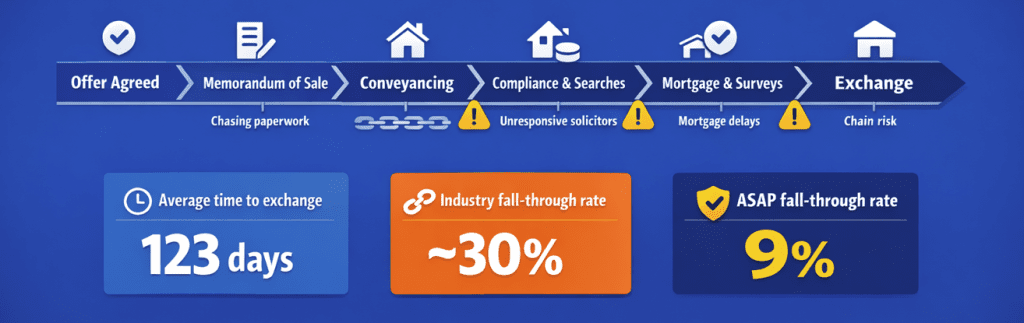 This is where outsourced sales progression can deliver real commercial value. A dedicated sales progression partner provides consistent oversight of the transaction, proactively chasing updates, resolving issues early and keeping all parties aligned. At ASAP, our fall-through rate is just 9%, compared with an industry average of approximately 30%. Crucially, outsourcing also frees negotiators and branch managers to focus on winning instructions and supporting clients, while a sales progression specialist ensures each sale is driven through to completion.